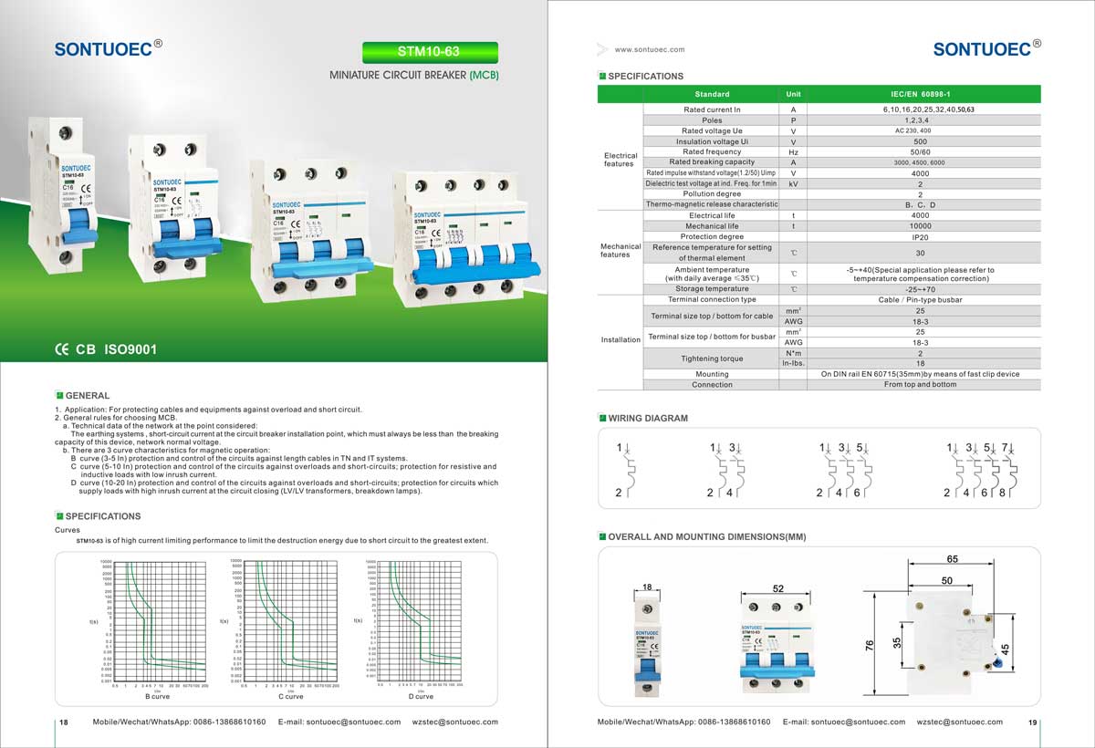 SONTUOEC വിവിധ ചെറുകിട ഇലക്ട്രിക്കൽ ഉപകരണങ്ങളുടെ ഉത്പാദനത്തിൽ വൈദഗ്ദ്ധ്യം നേടിയ ചൈനീസ് വിതരണക്കാരിൽ/നിർമ്മാതാക്കളിൽ ഒരാളാണ് STM10-63 സീരീസ് ഹൈ ബ്രേക്കിംഗ് മിനിയേച്ചർ സർക്യൂട്ട് ബ്രേക്കറിന് ഘടനയുടെ നൂതനമായ സവിശേഷതകൾ ഉണ്ട്, പ്രകടനം വിശ്വസനീയം, ബ്രേക്കിംഗ് കപ്പാസിറ്റി ഉയർന്ന, രൂപഭംഗി, അതിൻ്റെ ഷെല്ലും ഭാഗങ്ങളും ആഘാത പ്രതിരോധം, ശക്തമായ ഫ്ലേം-റെറ്റാർഡ് മെറ്റീരിയൽ കൊണ്ട് നിർമ്മിച്ചതാണ്. ഇത് 50 അല്ലെങ്കിൽ 60 ഫ്രീക്വൻസി, Ue 400V ഉം അതിൽ താഴെയുള്ളതും, Ui 63A ഉം അതിനു താഴെയുള്ളതുമായ പവർ സിസ്റ്റത്തിന് അനുയോജ്യമാണ്. ഇത് IEC60898.1, GB10963.1 എന്നീ മാനദണ്ഡങ്ങളുമായി പൊരുത്തപ്പെടുന്നു.